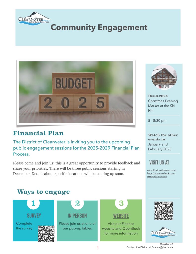 2024-12-06 – The District of Clearwater is excited to begin the 2025-2029 Financial Plan process, and your input is essential. Help shape the future of our community by sharing your feedback and priorities.