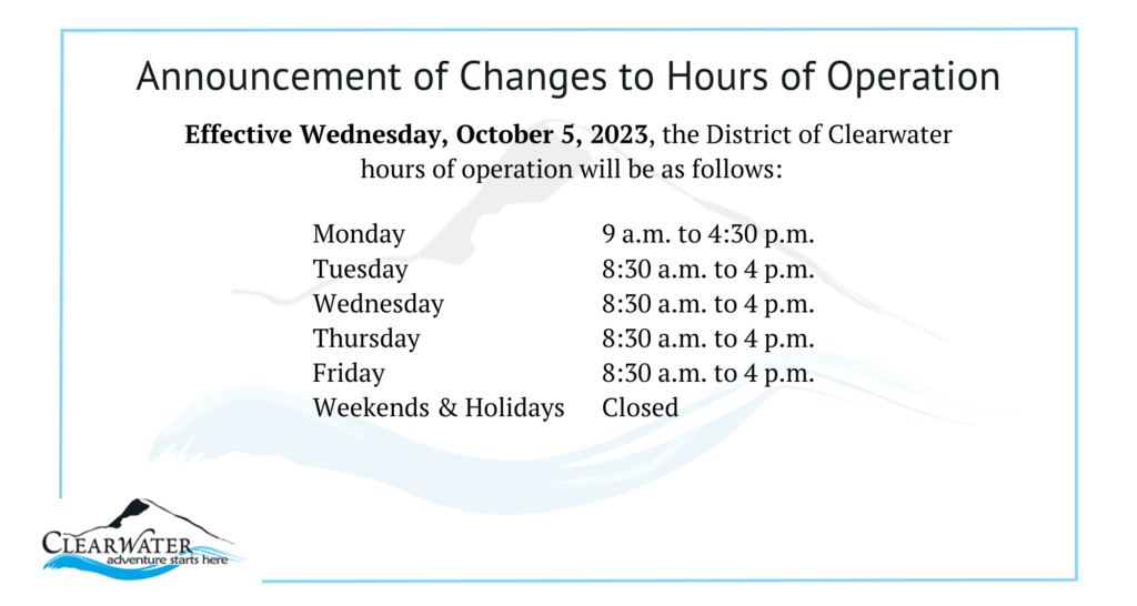 2023-10-05 — Effective immediately, the new hours for the District of Clearwater are noted in the graphic below. Email admin@docbc.ca with any questions.