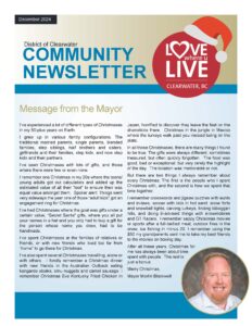 2024-12-05 – The District of Clearwater’s December Newsletter is here! Due to the ongoing Canada Post postal strike, the newsletter will not be mailed out as usual. Instead, we encourage everyone to keep an eye out for printed copies available around town, including at the District Office. Stay tuned for additional pick-up locations, which will be announced soon.