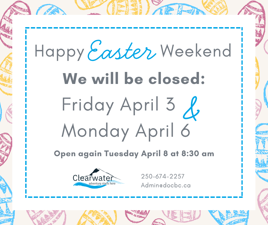 Happy Easter weekend from the District of Clearwater. Our office will be closed on Friday, April 3 and Monday, April 6, and will reopen on Tuesday, April 8 at 8:30 a.m.