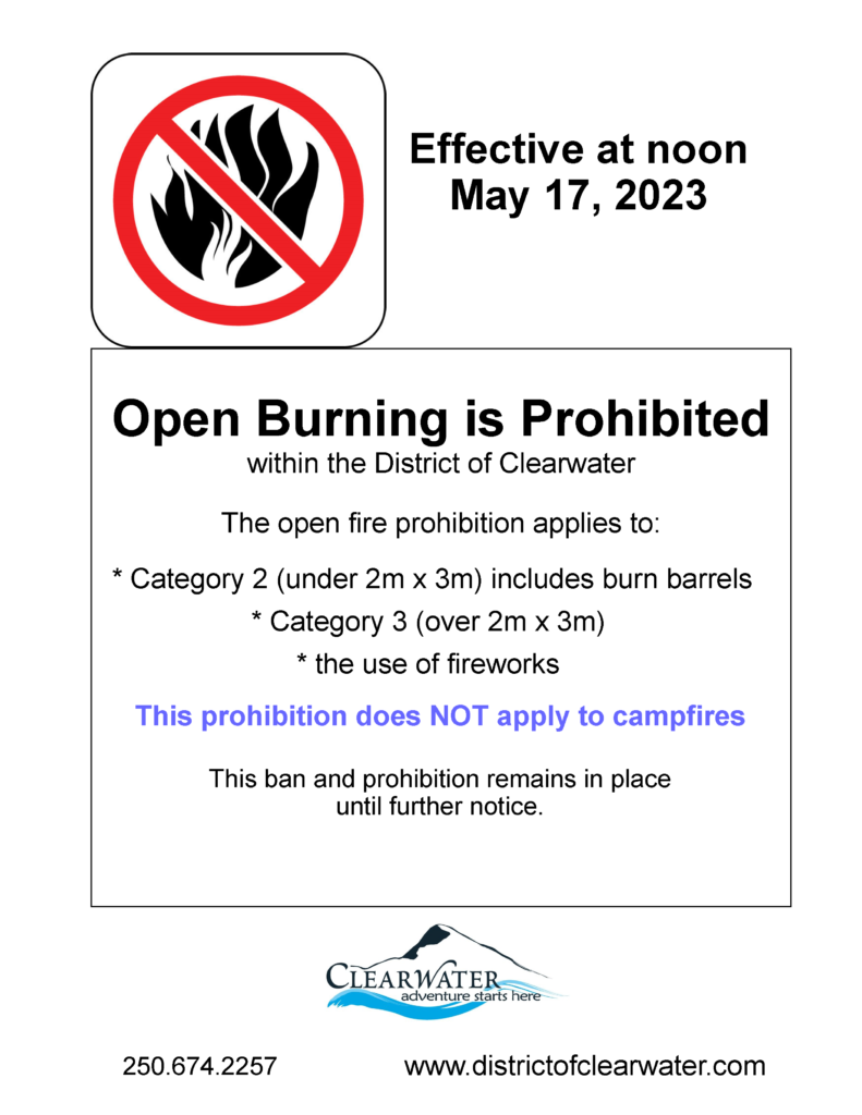 2023-05-16 — Effective at noon May 17, 2023, all open burning is prohibited (does not apply to campfires). See the below poster for details.