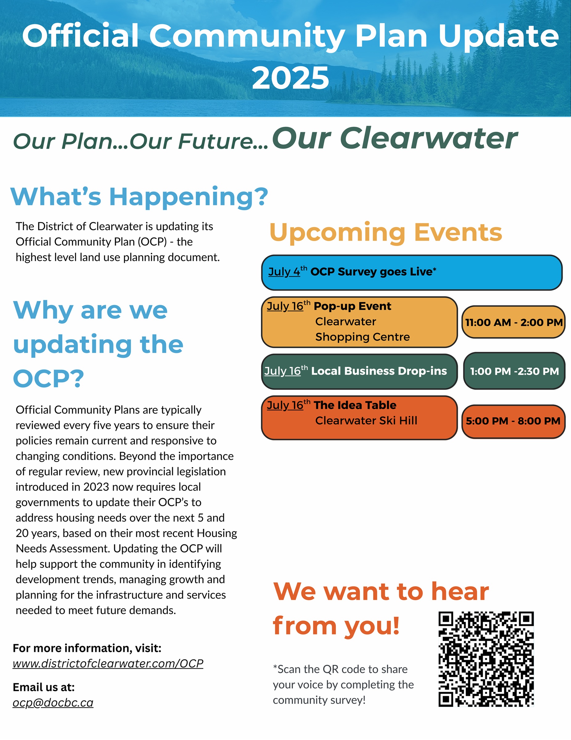 Clearwater, BC – The District of Clearwater is inviting residents and business owners to take part in updating the community’s Official Community Plan (OCP). The OCP is a key long-range planning document that reflects the values, aspirations, and priorities of the community, guiding decisions about land use, housing, infrastructure, and services.