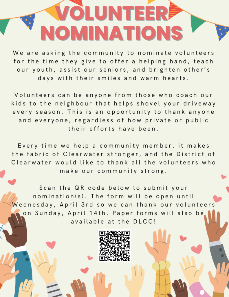 2024-03-11 – Nominate a volunteer! Click the link to fill out the survey or pick up a paper form from District office. Submissions will be accepted until April 3 so we can thank our volunteers on Sunday, April 14!